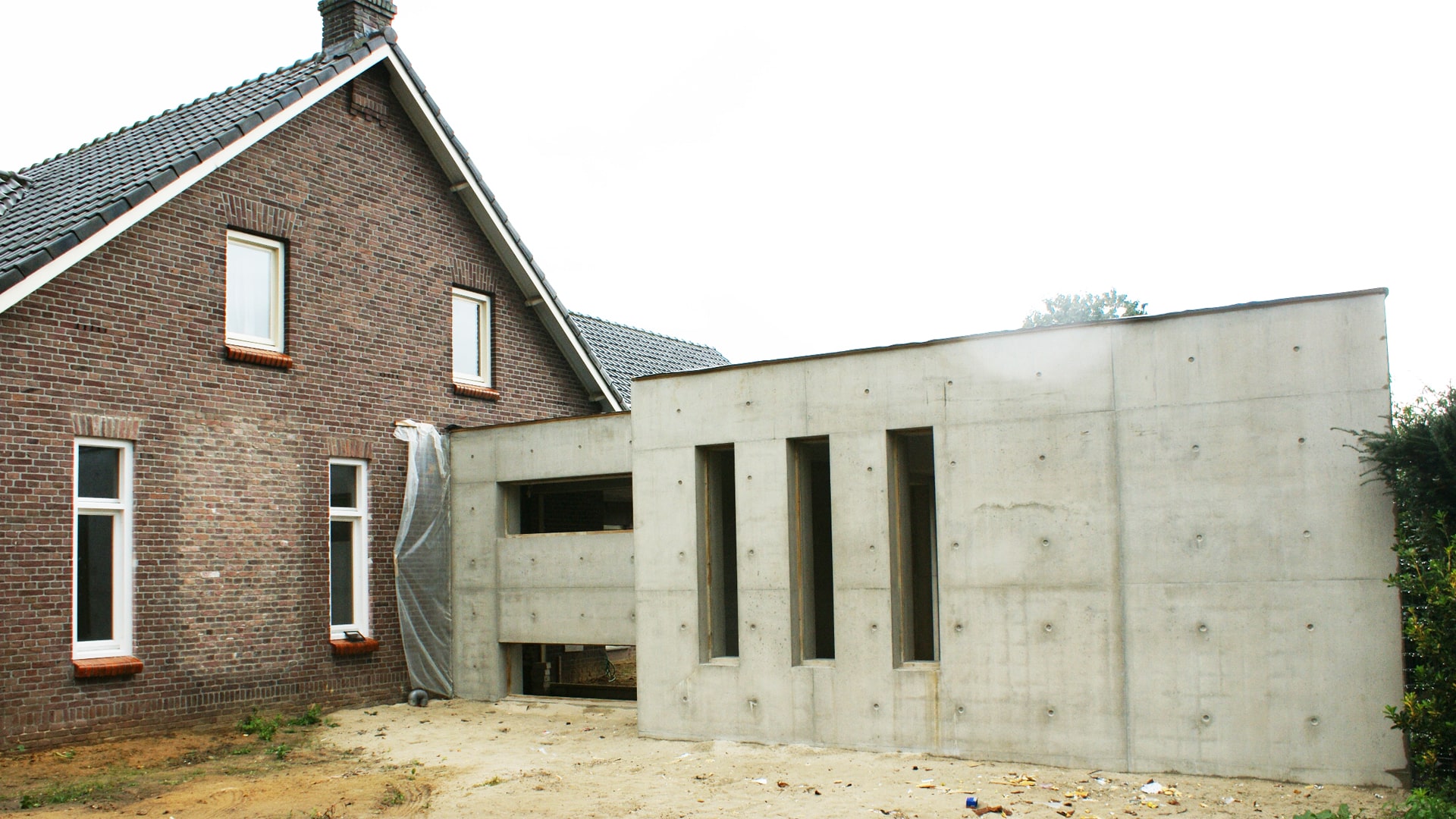 De opdrachtgever had eigenlijk de wens om een volledige woning in beton te willen bouwen. Maar men wou de ligging van hun huidige woonhuis niet verruilen. Van daaruit is er gekeken naar aanpassing van de bestaande woning. Binnen het bestaande gedeelte zijn een nieuwe slaapkamer met sanitaire voorzien en een bibliotheek annex study gerealiseerd. De uitbreiding is geheel in het door de opdrachtgever gewenste schoon beton uitgevoerd. Dit gedeelte bestaat uit een tussenlid, zitkamer en overdekt terras..